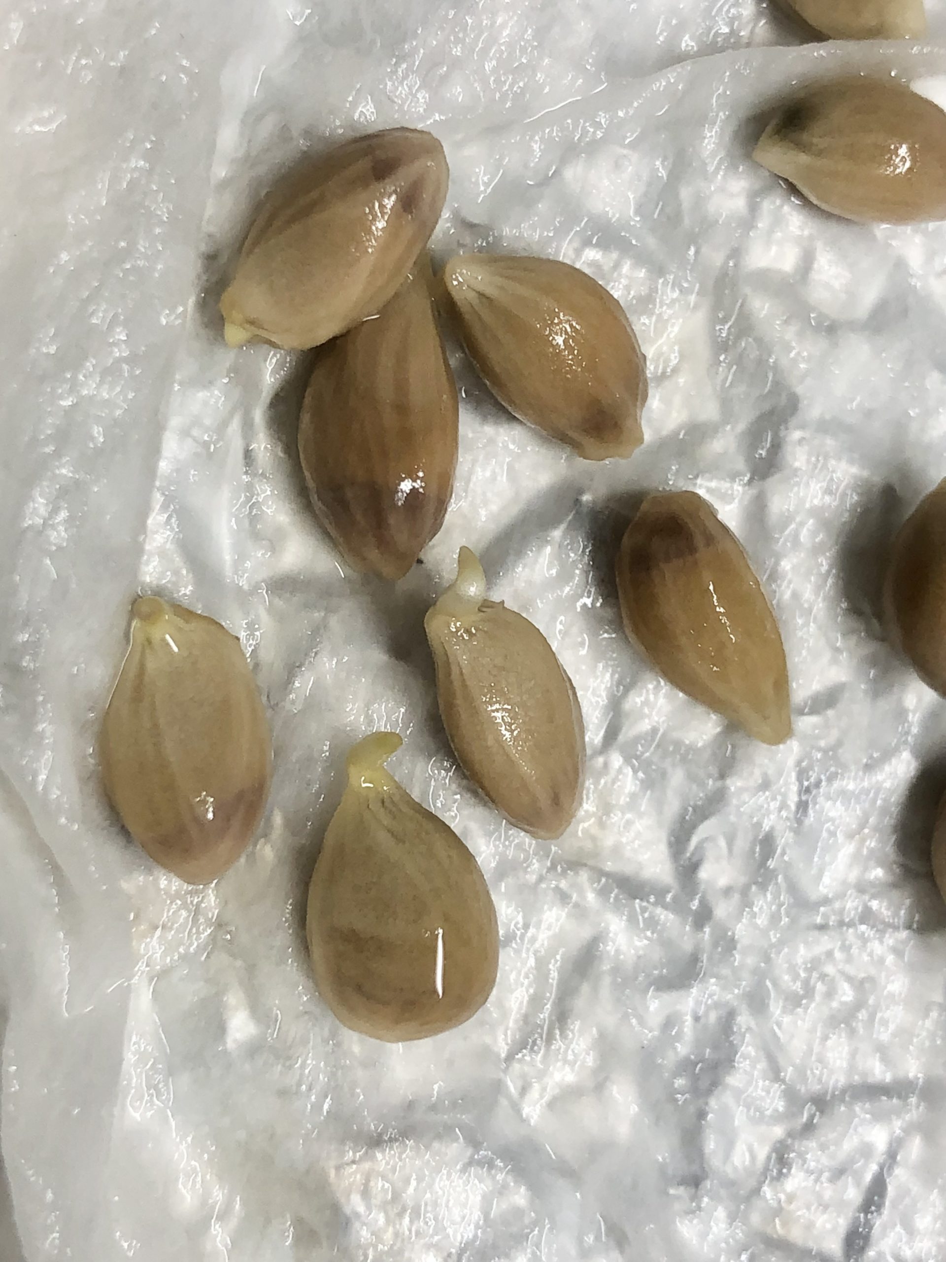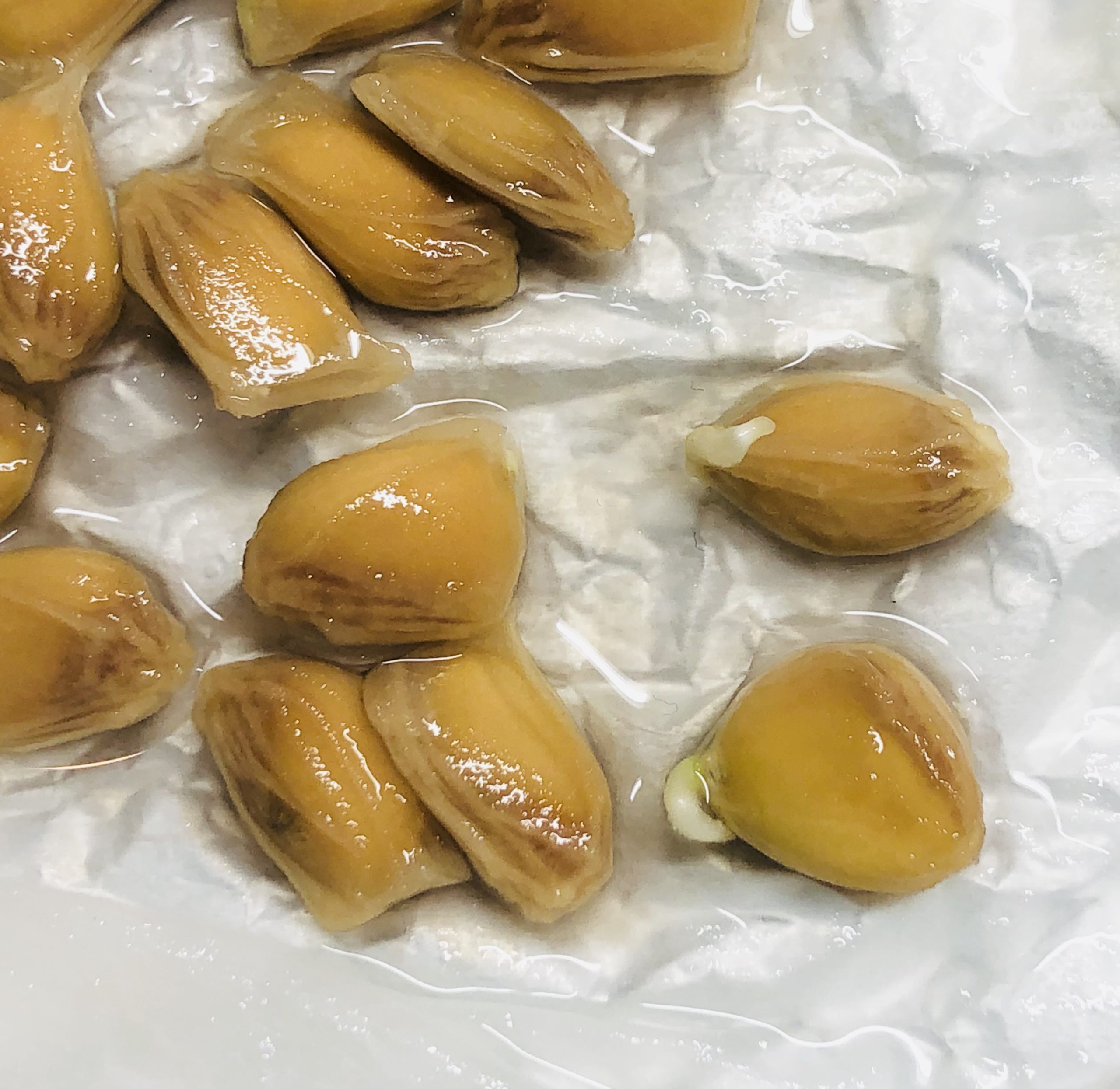 十分に湿らせたキッチンペーパーに包んで、1週間ほどで根が出ました。ホントに種が変化するのか半信半疑だったのだけれども。