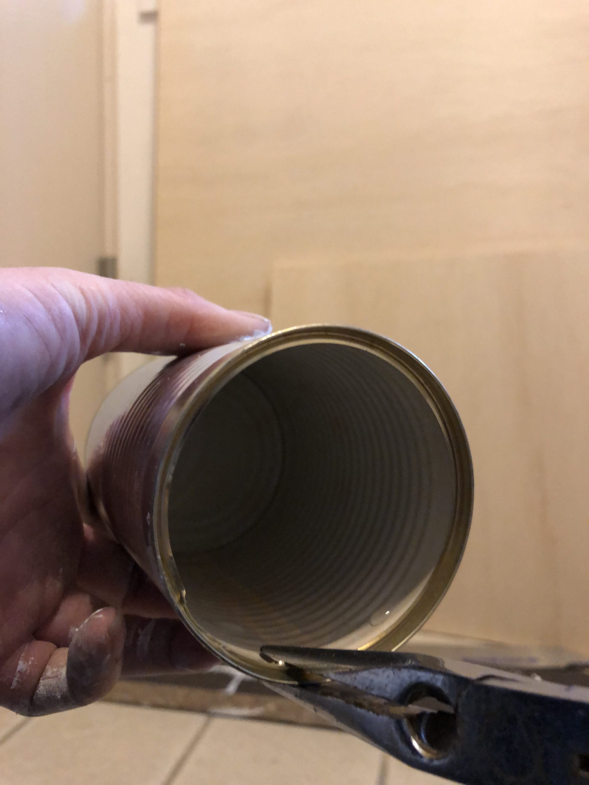 缶切りでフチを切る方法もどこかのサイトで見たのだけど、うまくキレイに切れず、ささくれ立ってしまって逆に危なくなってしまったので、素直にラジオペンチで切り口をへし折っていきます。