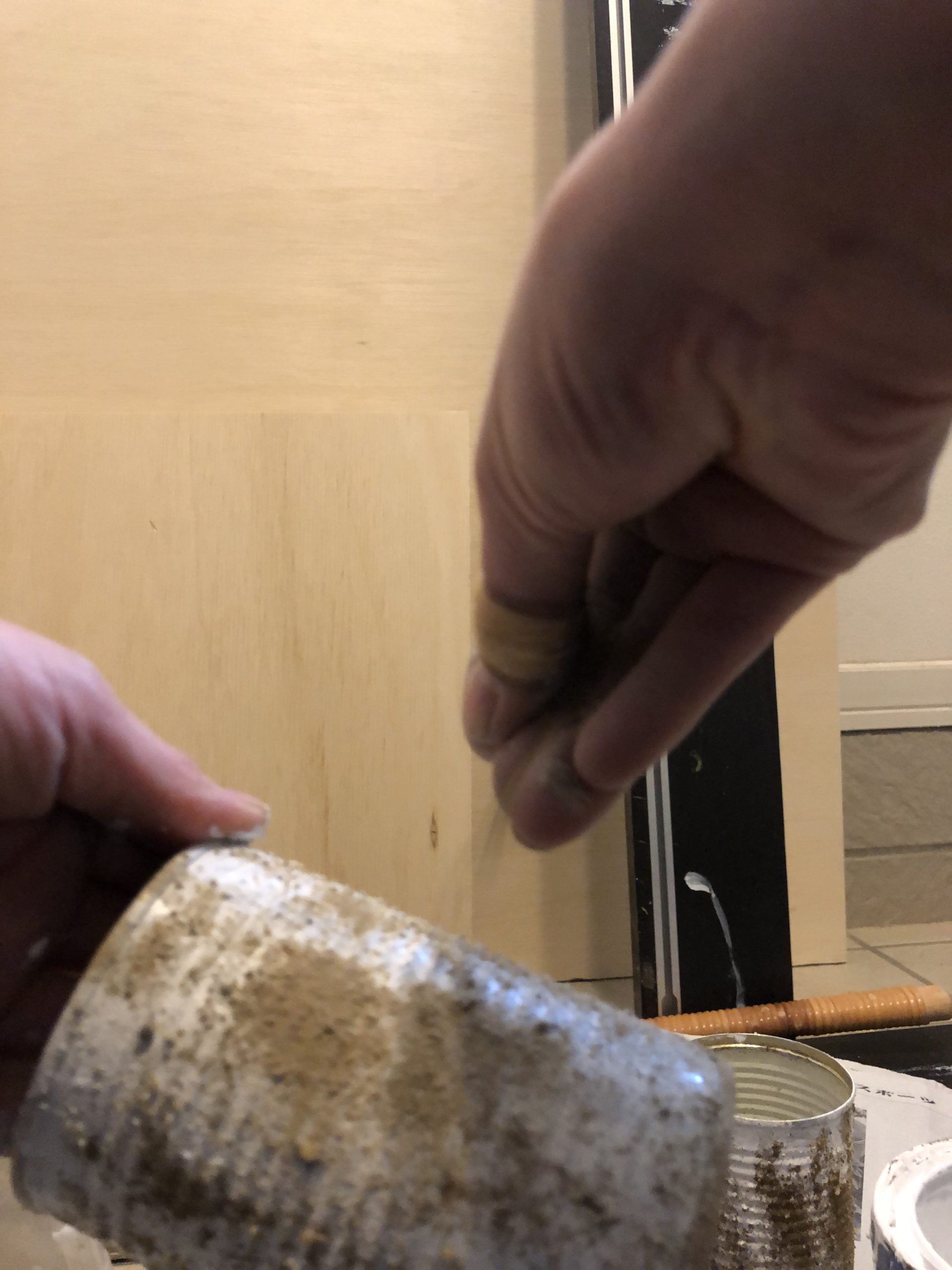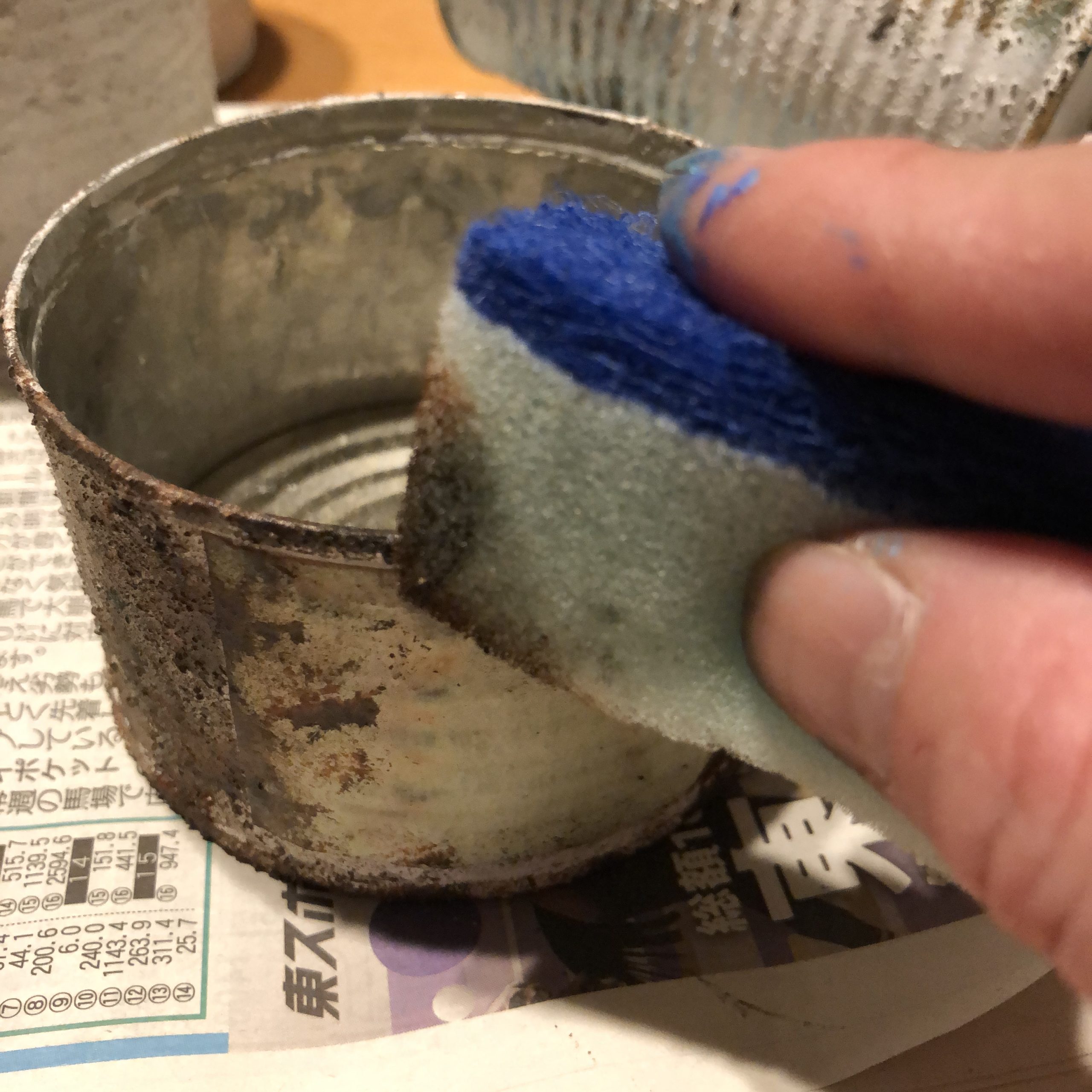 茶色•黒•紺•白あたりを混ぜて色を作り、スポンジでトントンと叩くように塗っていきます。色がのりすぎて、めちゃくちゃ汚しが入ってしまいましたが、味です、味。売り物じゃないから多少不恰好でも全然大丈夫です!
