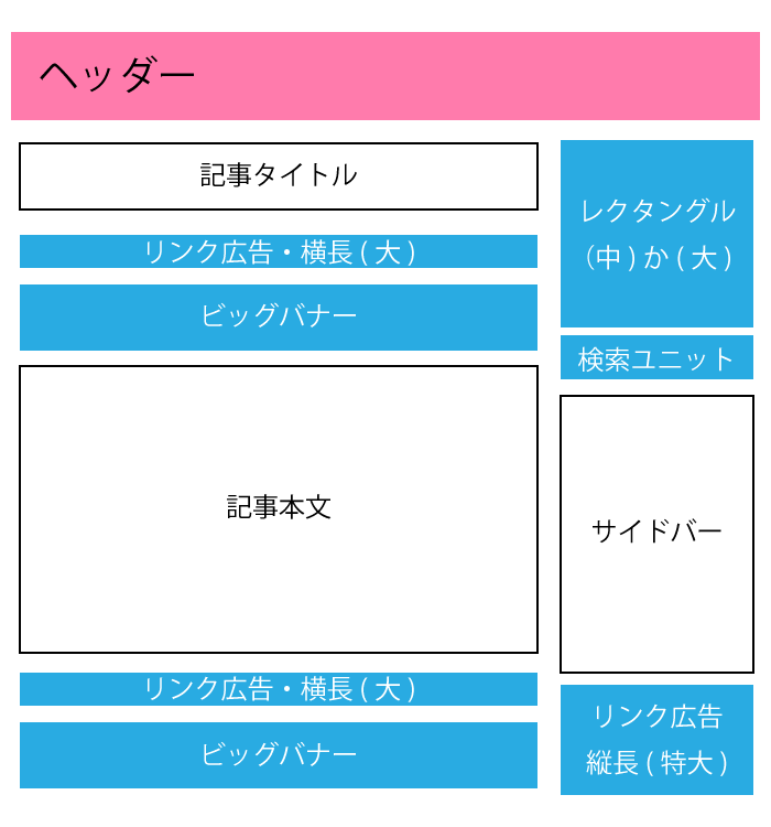 となっている。 つまり1ページに掲載できるアドセンス広告は、最大8つ。 師匠ブログの言う通り、せめて通常ユニット広告とリンクユニットは最大数配置したいので、 wordpressで作っているものは、 single.phpでは、記事タイトル下と記事終わりの2ヶ所に、 リンク広告・横長(大)728×15とビッグバナー728×90をそれぞれ配置し、 右サイドバートップにレクタングル(大)か、もしくは(中)を配置、その下に検索ユニットを配置、 右サイドバーの一番下にリンク広告・縦長(特大)200×90を配置した。 つまり下のような感じ。