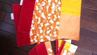 カーテンを作ったときの生地が余っていたので、何か作れないかと思い、ハギレ達をつなぎ合わせて、ランチョンマットとコースターを作りました。サイズは、ランチョンマットは、32×45cmコースターは11×11cmちょうどいいサイズに出来上がったと思...