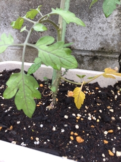 2本植え替えたうちの左側のトマトの下の方に、白いプツプツしたものが出てきて、虫かと思って悲鳴をあげてしまった。