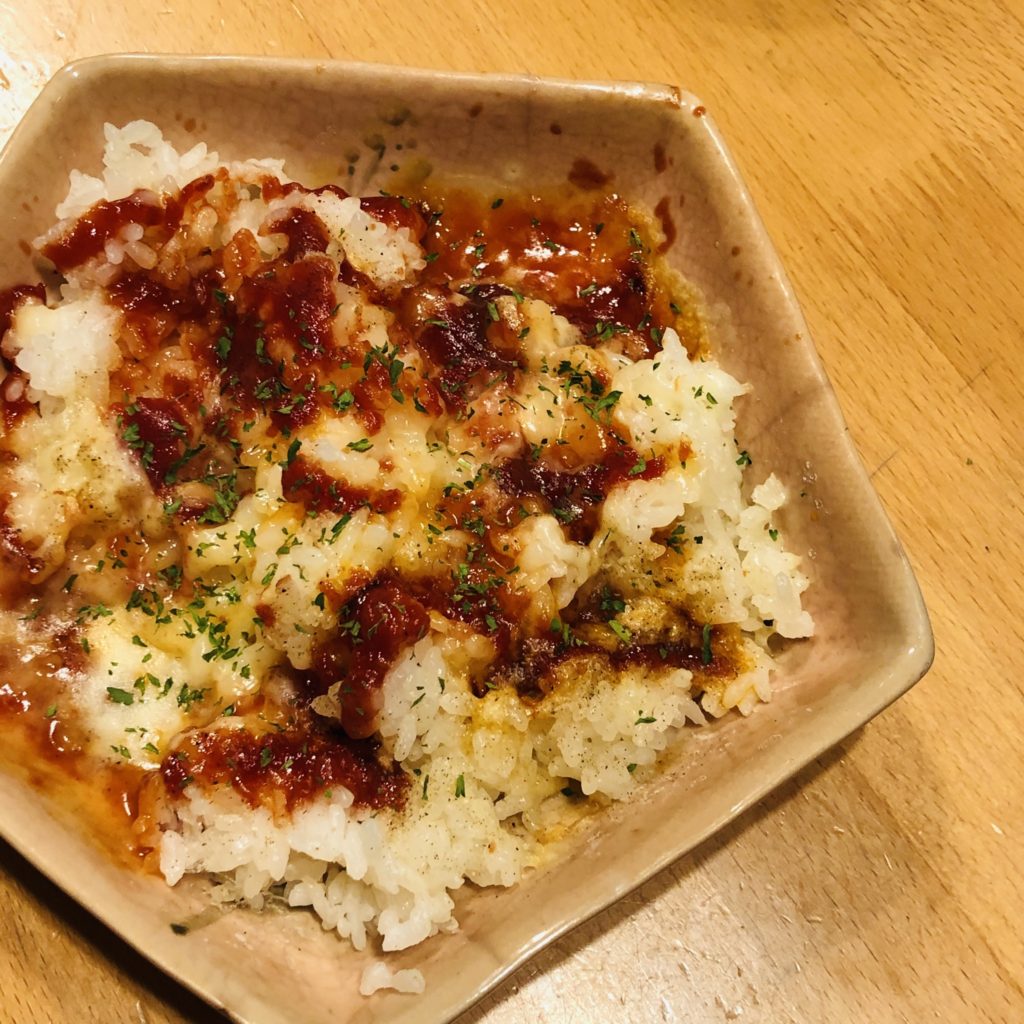 冷やご飯にとろけるチーズ、ケチャップ、塩こしょうをかけてチーンとしただけのもの。ビールのアテに最適。残り物で作ったので食費は0円。今日は残飯処理の日でした。