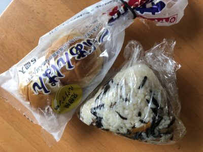 昨日の晩ご飯の残りのひじき煮を混ぜたひじきおにぎりと、残ったアンパン。